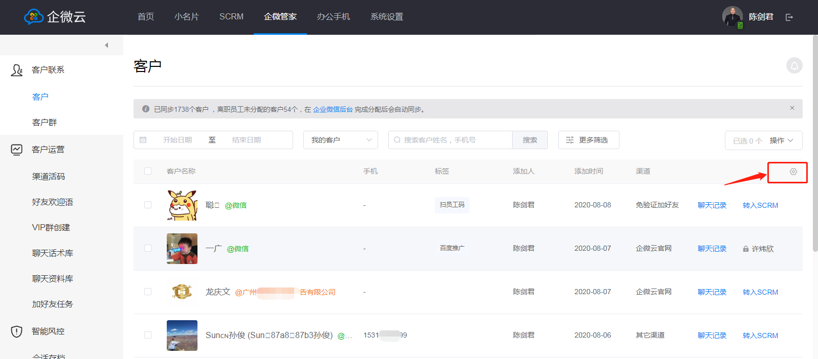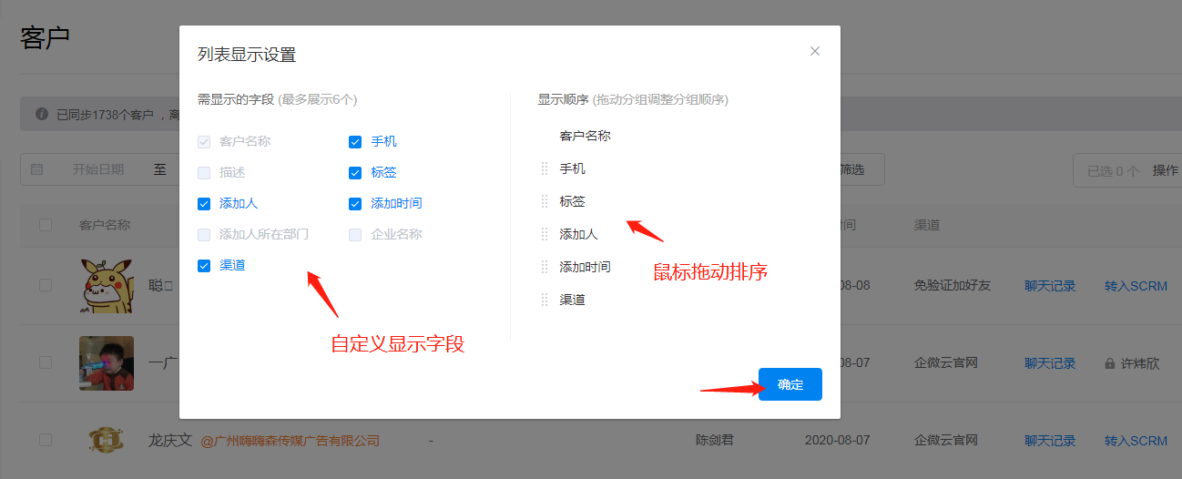 根据企业不同成员对客户列表展示内容需求的不同,可以在企微管家设置客户列表的展示字段。