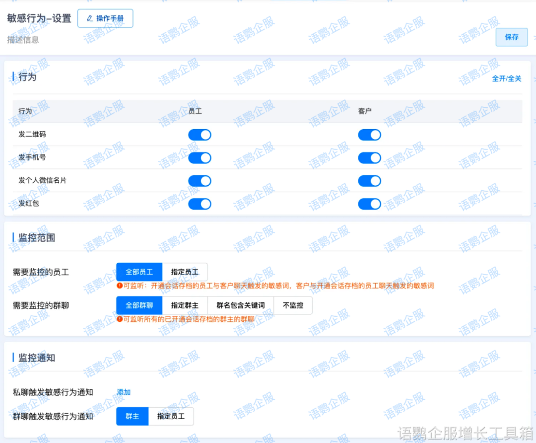 在企业微信平台上发布、传播违法违规信息,例如色情、赌博、暴力、政治敏感内容等,都属于严重违规行为。建议在企业微信平台上发布的所有内容,都必须遵守法律法规和平台规范,避免发布任何违规信息。企业可以借助语鹦企服的会话存档【敏感词监控】功能,对发布内容进行自动检测,提醒员工及时发现并修改违规内容,避免触碰红线。