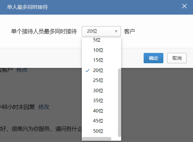单人最多同时接待:可以设置单人同时接待客户的数量,最少为一位,最多50位;