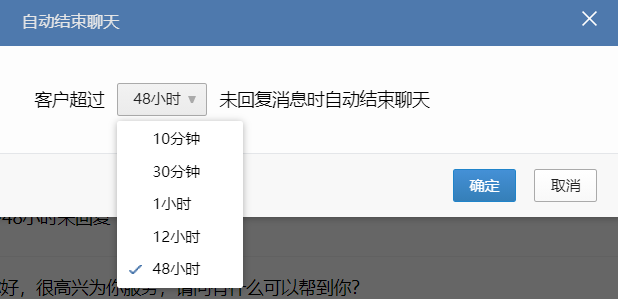 自动结束聊天:可以设置客户多久未回复消息自动结束聊天,可选时间为10分钟、30分钟、1小时、12小时、48小时;