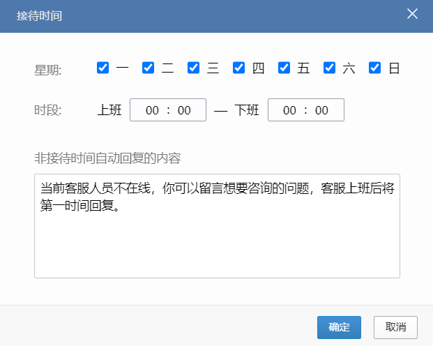 接待时间:可以选择周一到周末的任意时间段,并设置非接待时间的回复内容;