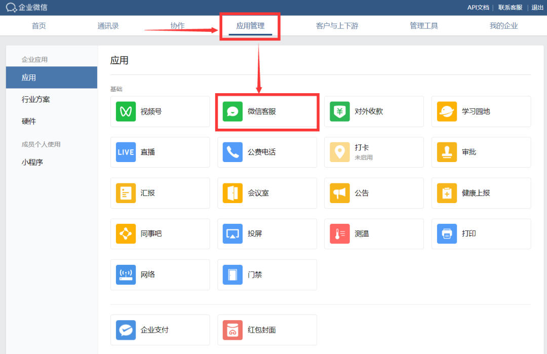 我们可以在微信内、外各个场景中接入微信客服,用户发起咨询,配置接待人员即可回复消息,还有聊天工具栏、升级服务等工具帮助企业做好服务。接下来,就让我来带你了解企业微信客服的详细打开流程吧!1.登录企业微信后台,点击应用管理,选择微信客服;