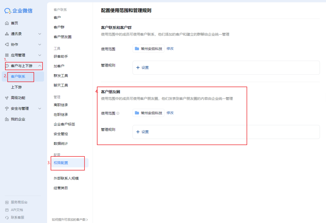 b)设置成员发表权限:点击 “客户与上下游”-“客户联系”-“权限配置”-“客户朋友圈”,可以设置哪些成员有发表客户朋友圈的权限 。