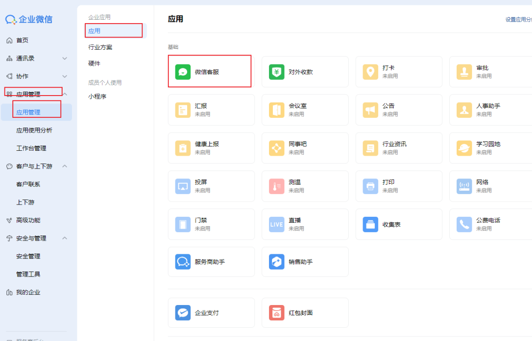a)创建:"后台"->“应用管理”->“应用”->“微信客服”,点击 “创建微信客服”。按照提示填写客服账号名称、接待人员等信息后,点击 “确定” 完成创建。