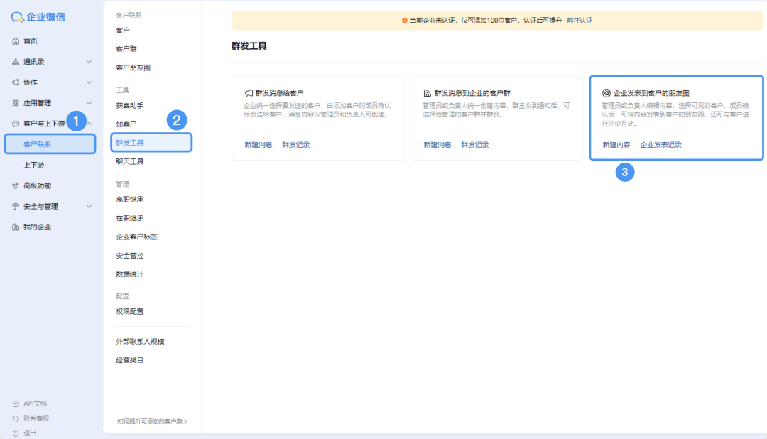 b)超级管理员支持在【管理后台->客户与上下游->客户联系->群发工具->企业发表到客户的朋友圈】进行新增企业朋友圈。