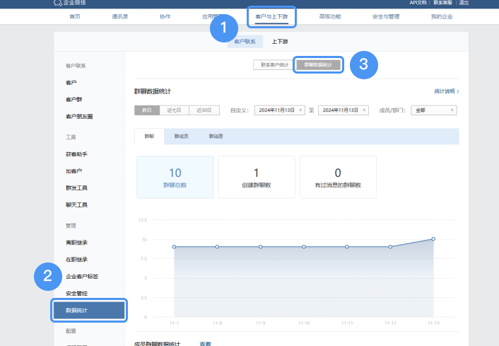电脑端【管理后台->客户与上下游->客户联系->数据统计->群聊数据统计】查看