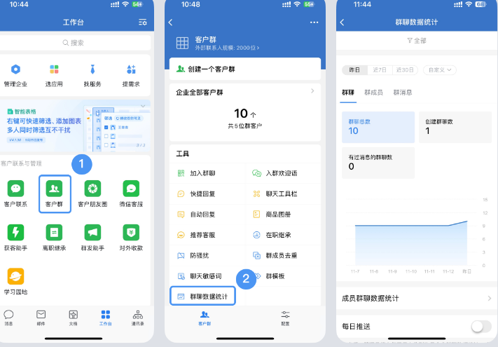 开启入群验证:客户群聊天界面->群管理->入群验证->需群主或群管理员确认群聊数据统计:管理员和负责人可通过【手机端->工作台->客户群->群聊数据统计】查看管辖范围内成员的客户群相关数据
