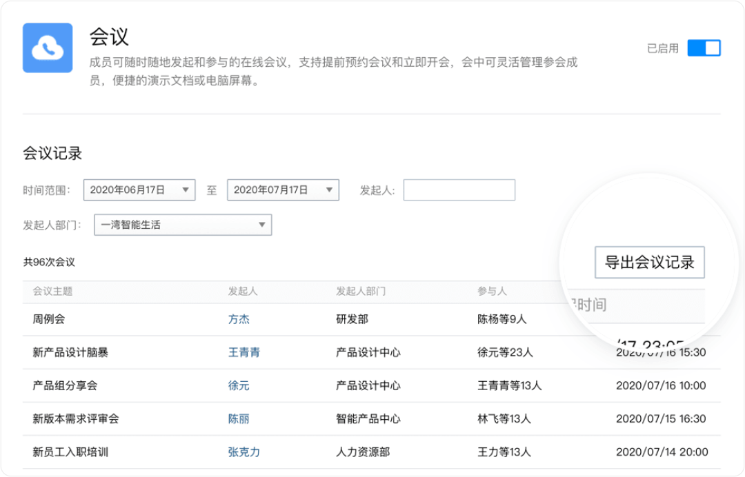同时,企业可以在管理后台查询和导出会议记录了,可以查看到在什么时间内、由哪些部门的哪些人发起了多少会议、有哪些人参与了,满足企业会议管理需求。