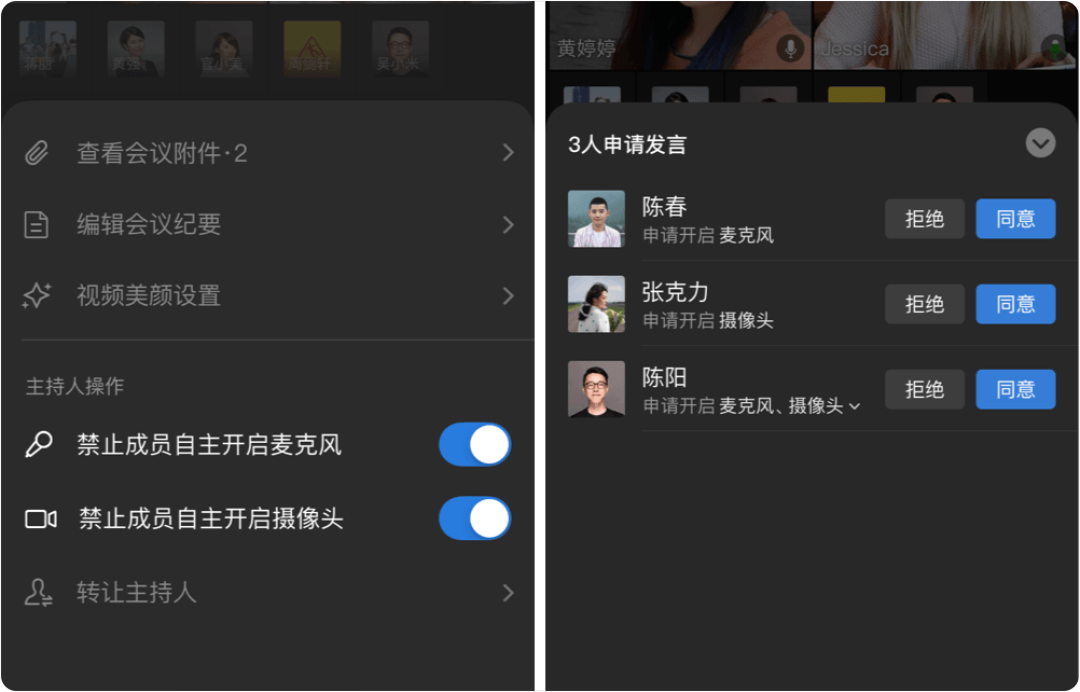 会议功能增强了对“静音”的强管理:会议的主持人可以禁止成员自主开启麦克风,需要开麦的成员可以向主持人发申请,让会议发言更有序。另外,在视频会议中,麦克风和镜头的开关可以分开设置了:你可以在打开摄像头的时候关闭麦克风,等需要发言时再开麦交流。