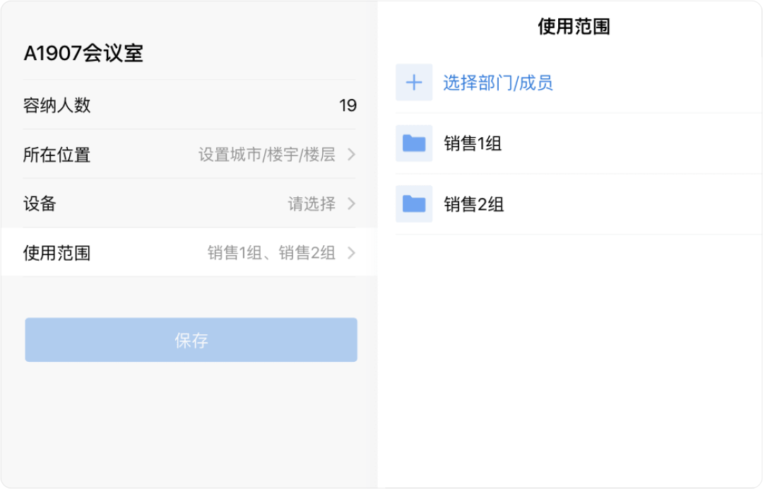 如果公司的部分会议室仅开放给指定部门使用,或者只允许秘书预定,那么管理员可以给会议室设置使用范围,将指定会议室仅开放给部分成员预定。另外,对于有开发能力的企业和服务商,我们还开放了会议室功能的API,方便企业把原有的会议室系统对接起来,轻松实现移动化使用。