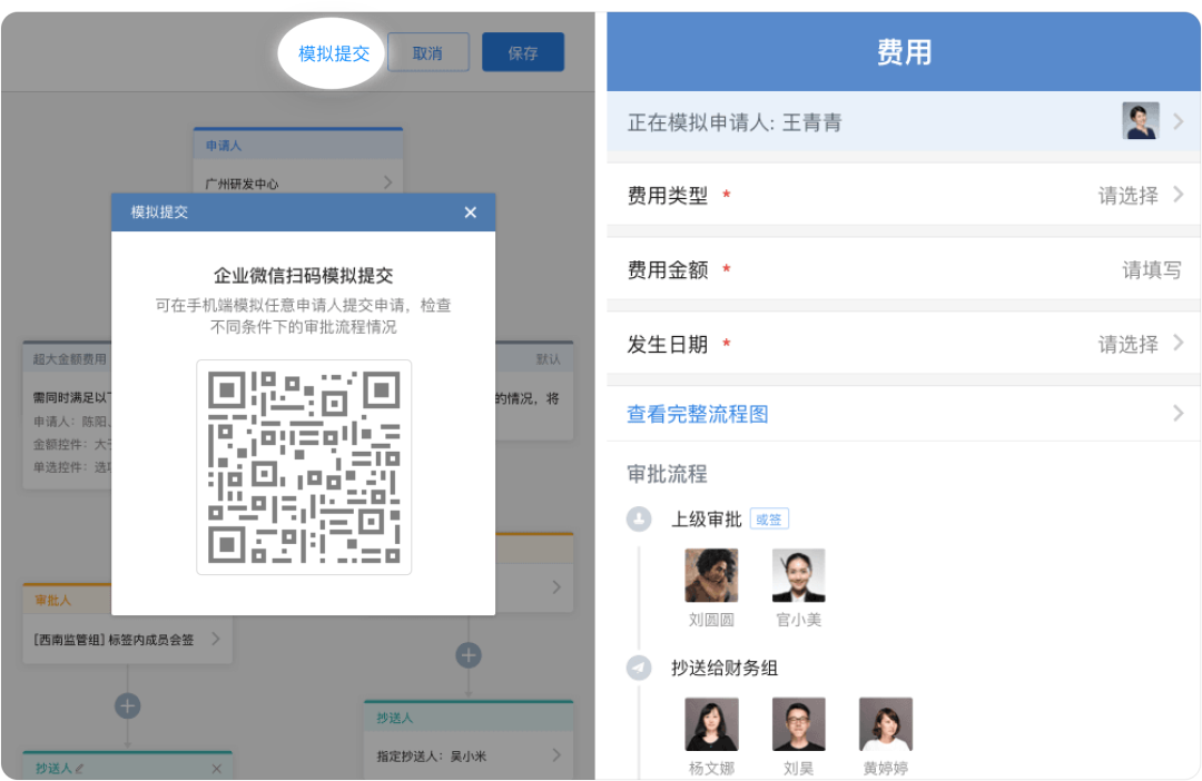 管理员可以在保存审批规则之前,自己先扫码体验一下这个审批流程,模拟任意一位申请人提交审批单,检查每个节点和条件的设定,确保流程顺畅无误。新版本还进一步丰富了审批规则的设置,满足更多场景需求:- 可以指定上级部门中特定类别的成员审批(如“财务”)