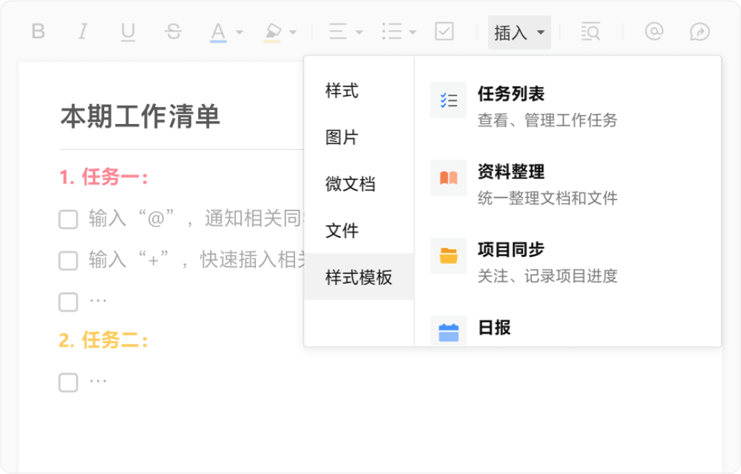 - 在微文档中可以快速插入模板了(如任务列表、资料清单、日报等),让你的文档内容丰富又层次清晰。