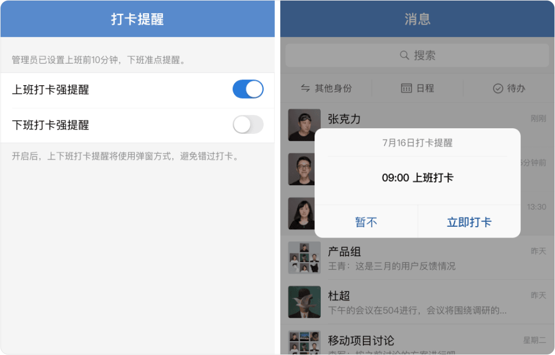 设置“打卡强提醒”。如果在需要打卡的时候没有打卡,会直接收到弹窗提示,绝对不会再忘了。新版本还支持企业管理员设置自由上下班打卡的间隔时间,上班打卡之后间隔相应时间才可以打下班卡,既避免员工误打卡,又满足管理需求。
