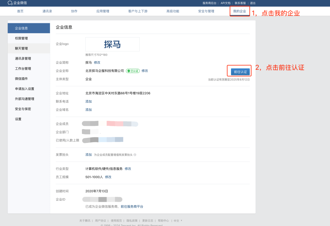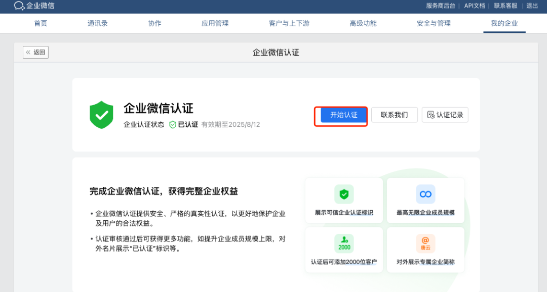 第一步,登录企微后台,点击“我的企业->前往认证”。
