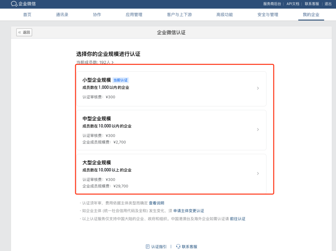 ●中型规模企业( 1000<企业成员规模≤10000),收取企业成员规模费为人民币2700元/次;●大型规模企业(企业成员规模>10000),收取企业成员规模费为人民币29,700元/次。