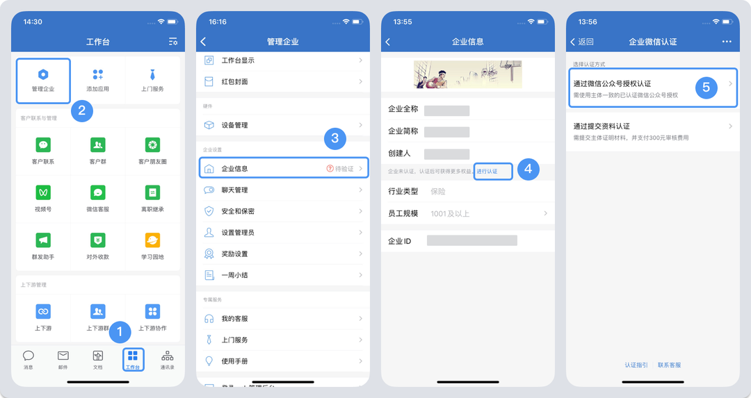 超级管理员进入手机APP:工作台->管理企业->企业信息->进行认证->微信公众号授权认证(或者通过提交资料认证)。