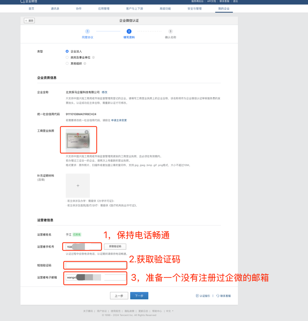 营业执照照片、运营者姓名、运营者手机号(接收验证码)、1个没有注册过企微的邮箱。