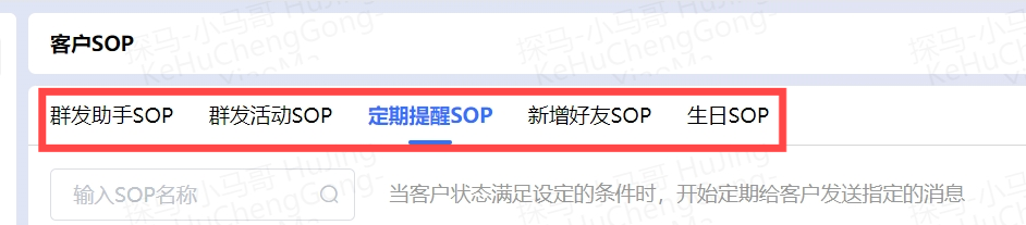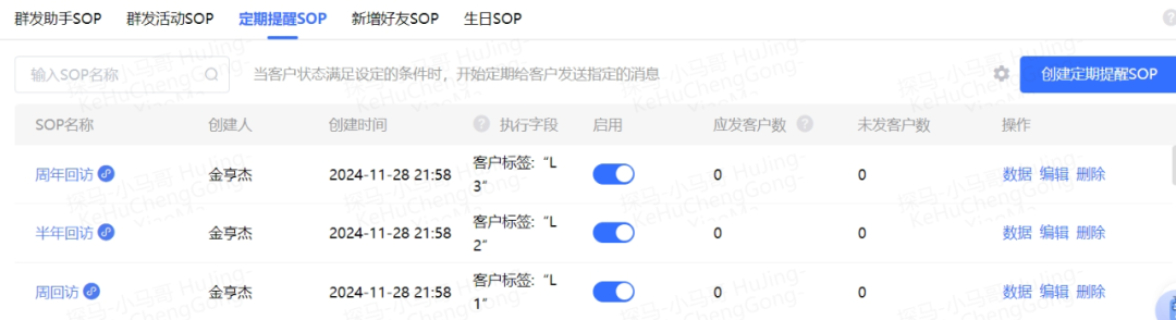 群发活动sop,当需要群发某项活动或者内容时,管理员可以下发任务,让销售在指定的时间,向指定的客户,发送指定的内容。定期提醒sop,当客户满足一定条件后,提醒销售自动发送信息。比如,当客户意向度为“中”时,发送详细的产品介绍。