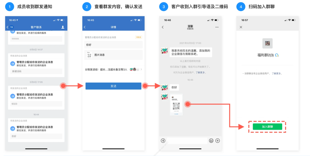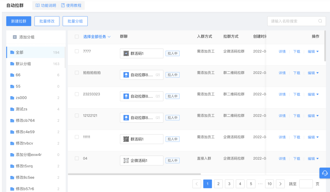 - 拉群流程自动化:当一个群活码关联的群人数达到上限后,会自动替换已满群聊二维码,将客户分配到有空位的群聊中,实现客户批量自动入群,极大节省人力成本,提高社群扩张速度。