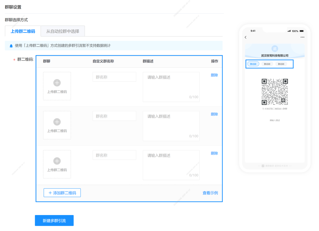 在实际运营中,企业还能通过修改活码信息、批量调整分组:做高价值客户运营时,让客户先加员工(方便深度跟进);做限时促销时,直接拉群(让客户秒进群下单)。这样既能把核心客户 “攥住”,又能抓住临时流量,满足企业多场景建群的需求。例如:某教育培训机构在线上招生推广时,采用“先添加课程顾问老师,再入群”的自动拉群设置。这样不仅方便顾问老师针对性跟进孩子年龄、学习短板等,还能给家长推荐适合孩子的课程,从而深度沉淀意向客户资源。当家长进入群聊后,由于前期与顾问沟通过,他们对群体更有归属感,可以提高家长在群内交流孩子学习情况的积极性,提升群活跃度,利于后期的招生转化 。当企业需要引导不同客户进入不同的群聊时,客户入群路径繁琐,多个群聊二维码零散发布不便于管理。作为企业微信的官方运营工具——微伴助手,就可以帮企业解决这些困扰 ,让多群运营更加高效。微伴助手的多群引流功能,可以根据业务线配置多个群聊码,让客户扫描同一个二维码后,自主选择感兴趣的群聊加入,可以统计不同群聊的客户数据。