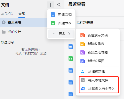 在电脑端打开文档后,可以点击页面右上角+ -> 更多->选择进行导入。