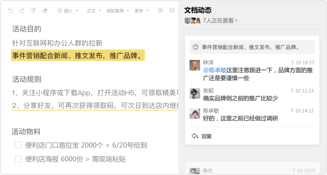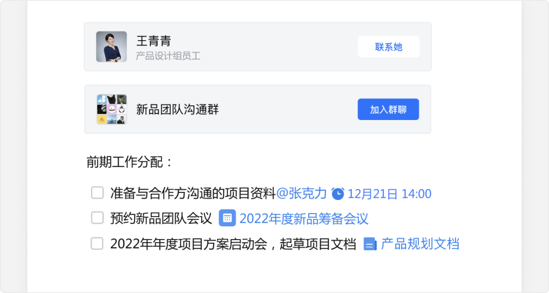 文档可以插入日程、待办、个人名片、群名片、聊天记录、定时提醒等丰富元素,支持联系他人、加入群聊等快捷操作。