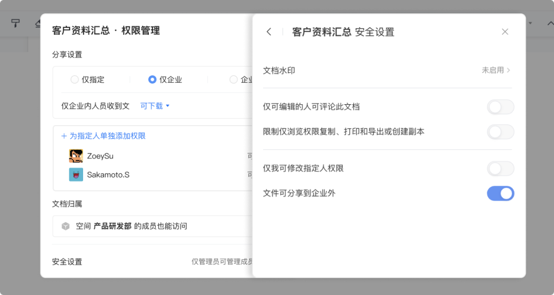 可通过右上角【菜单-权限管理】,按企业组织架构来设置文档访问、编辑、评论权限,也可设置企业外临时访问有效期,轻松保证企业资料安全。