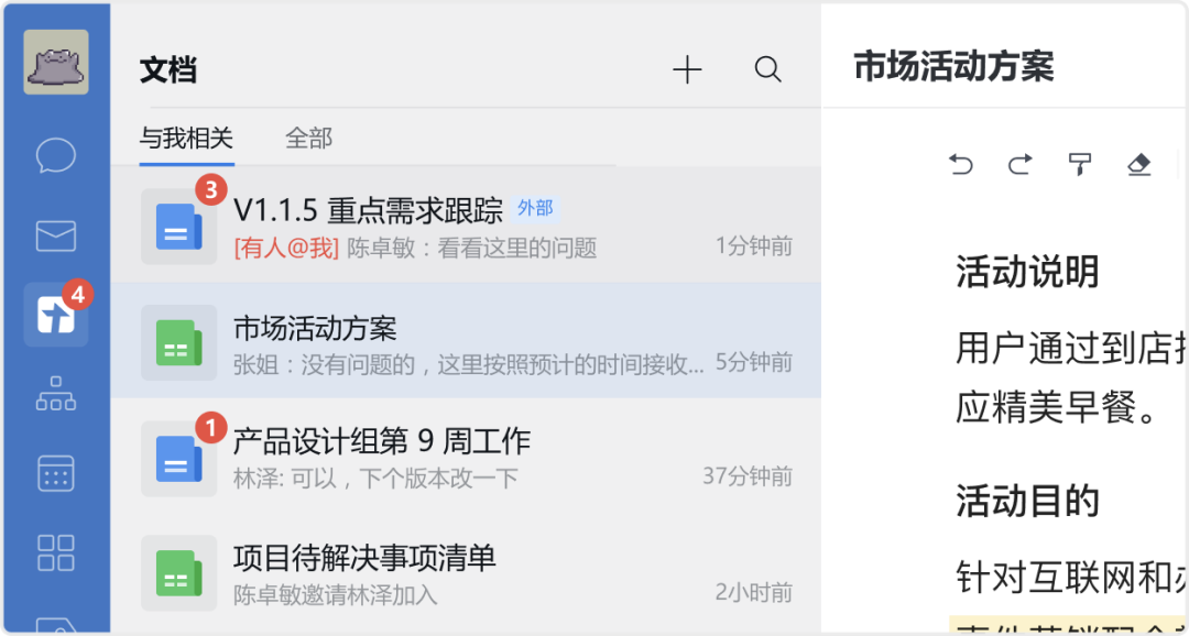 文档动态通过消息列表通知,最新动态及时触达,信息流转更高效。