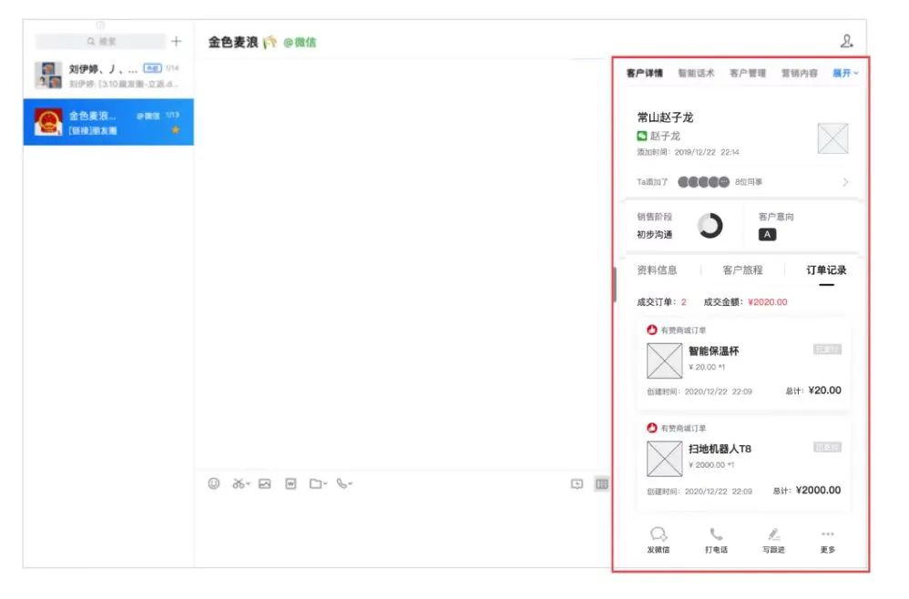 在探马SCRM的企微侧边栏,有客户详情、智能话术、客户管理、营销内容等多个功能。并且,也能与有赞等平台订单打通。在做客户跟进的时候,销售员工可以快速查看客户基本信息、订单记录、查找话术、发送营销素材等,提升客户沟通效率。