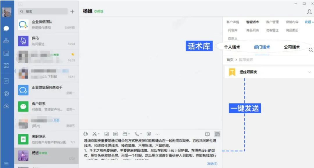 我们在微信聊天的时候,都知道“对话迟迟不回消息”是种什么样的感觉。比如,同样面对两个客服,一个即问即答,沟通体验良好;一个断断续续,半天不说话。那么,后者很可能就会被删掉。专业及时的沟通回复,绝对可以增加客户对你的印象分。探马SCRM的“话术库”在企业聊天界面的侧边栏,包含销售自身习惯常用的“个人话术”、部门使用的“部门话术”、公司层面的“公司话术”。在跟进客户的时候,一键发送,快速回复解答客户问题,增加客户好感。