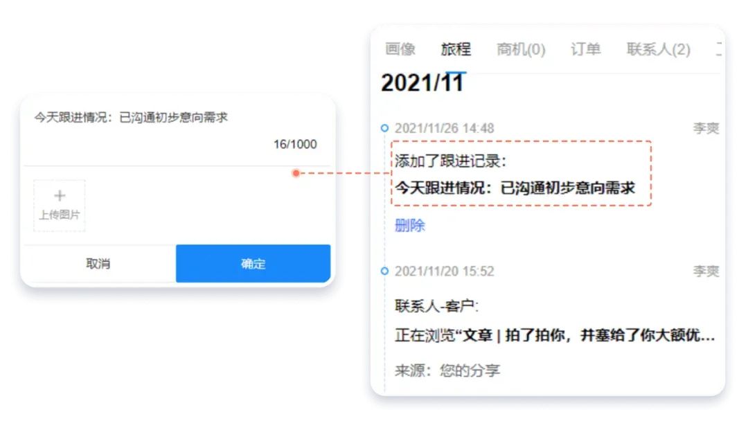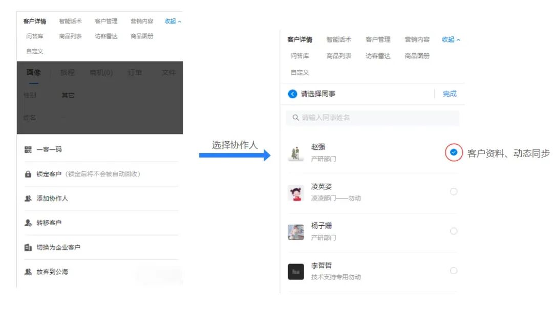 不少行业,是需要企业内不同角色配合去完成交付的。比如医美,销售拿到线索先跟进,达成到店意向,再由距离较近的线下门店接待人员负责接待,而后还要拉医师、助理。这种多服务角色的客户跟进,很容易造成跟进混乱(如重复跟进、重复沟通),从而对客户造成多次打扰,产生不好印象。通过探马SCRM,添加协作人,同步客户资料、访问动态等,非常适合多部门、多团队配合跟进客户。既不重复打扰,也不遗漏流程,密切配合,彼此协同。