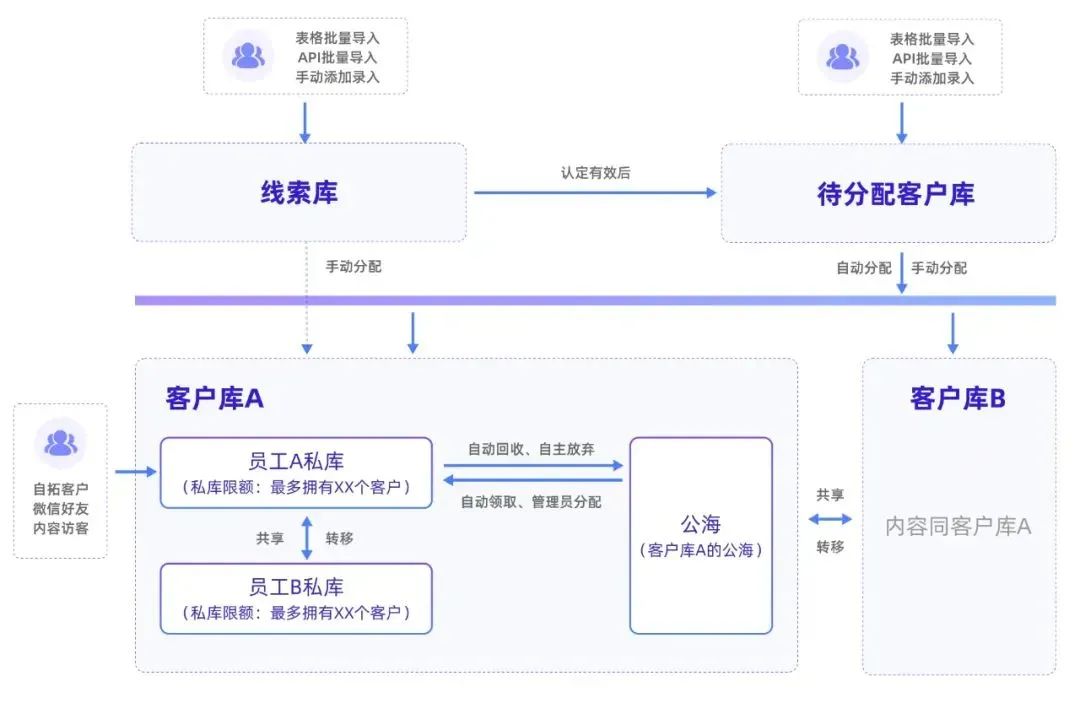一方面能提醒销售及时跟进客户,另一方面如果销售A跟进客户失败,还可以让销售B进行尝试。毕竟每个人销售方法不同,这名销售无法推进,另一名销售也许有办法成交,提升线索利用率。同时,可设置多个客户库,每个客户库都有自己独立的公海,对本客户库外的数据隔离,根据业务需求,企业可设置一个员工最多可以拥有多少个客户,及时锁定关键客户,有效提高员工跟客质量,用心服务好每一位客户。