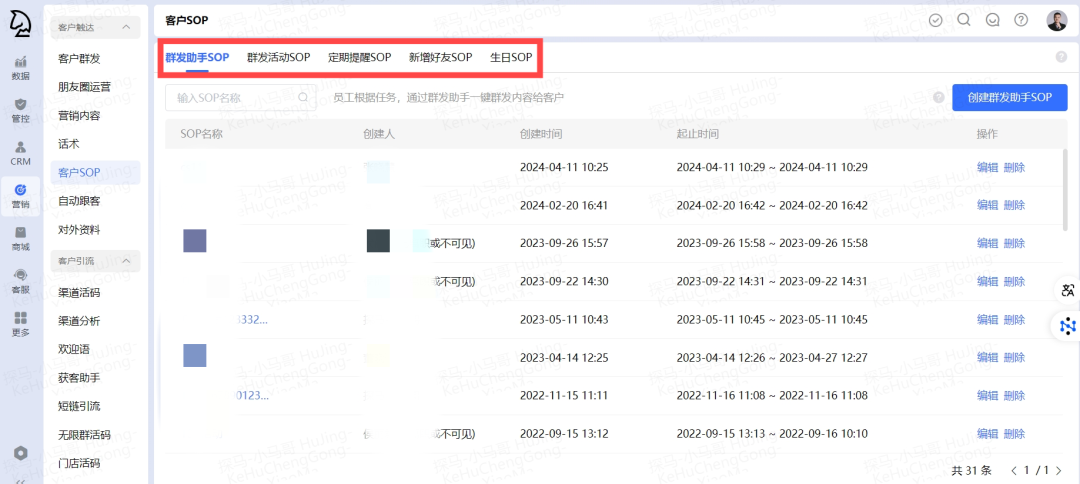 销售一般会同时跟进很多客户,很容易导致记忆混乱,忘记某个客户跟进到了哪一步,影响客户体验,甚至造成客户流失。用标准化动作去做客户跟进,才能提升跟进效率,也不会遗忘遗漏。比如探马SCRM的“客户SOP”功能,有群发助手SOP、群发活动SOP、定期提醒SOP、新增好友SOP、生日SOP等。比如“定期提醒SOP”,是在客户满意一定条件后,提醒销售自动发送信息。比如,当客户意向为“中”,就发送详细的产品介绍。“新增好友SOP”,是规范在添加新好友后应该做哪些动作,有利于销售新人快速上手。