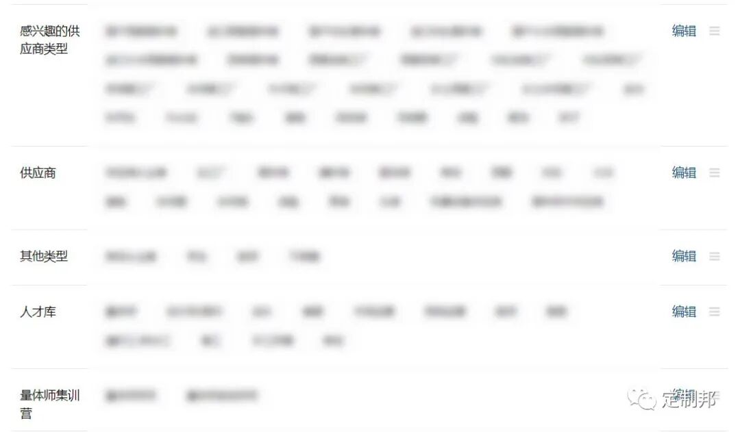 精细化管理的第一步,也是最关键的一步,就是把流量转化为用户,而其中会用到的关键工具就是「客户标签」我们举个例子,今天某定制店通过线上大众点评/小红书账户添加一个昵称叫@张先生的客户进入到你的私域(这里的私域指的是个人微信或者企业微信),如果你只知道对方昵称叫做@张先生的话,那么他只是你的流量,他与王先生、刘先生、马先生并无差别。但是如果@张先生身上有一些关键词,比如:#武汉、#时尚传媒行业、#基层搬砖人、#3个月内有置装需求,这样的@张先生是不是就更加立体了,那么这个时候的@张先生,才能真正算是你的客户。那么该如何给客户打标签?大部分人都是了解到什么信息就打什么标签,这会导致你的标签库非常乱,且不利于企业管理和使用。客户分层的核心标准是,企业需要100%基于自己的业务流程进行客户分层,以定制行业为例,业务路径大体就是:潜在客户、消费客户、复购客户、流失客户;也可根据用户等级参考下图进行更明确的客户分层。客户分群指的是对统一层级客户进行二次划分,维度上可以使得这个客户更加全面、立体一些,比如城市、学历、职业、收入、年龄等;也可以基于客户咨询内容,做预测式分群,比如:80%会消费、30%可能复购,当然这种判定需要定制店给出不同概率下的标准。标签体系是每个企业的内部共识语言,需要内部员工知道不同的标签代表怎样的用户特征,并能熟练的对私域下客户进行打标签。这里以定制邦企业微信的标签为例,不同客户、不同业务线都有明确的标签。