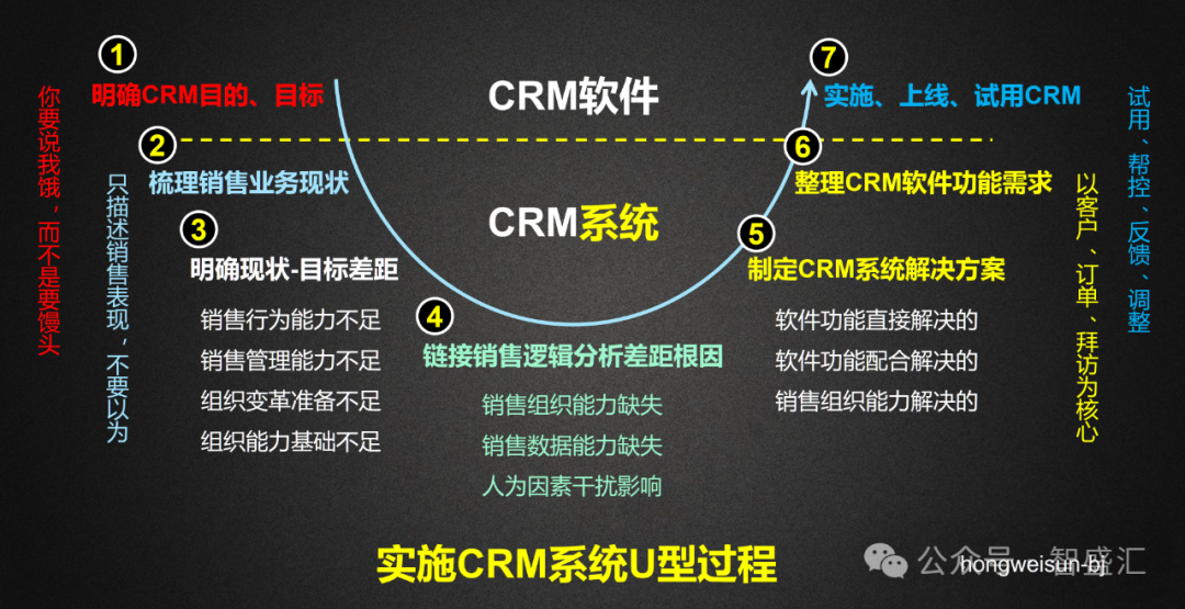 CRM 系统,是一个如何把销售业务变为数字化语言,进而能够提升销售能力,达成销售业绩的过程,软件只是承接这个过程的载体,让这个过程持续生效、落地;这个过程中不仅仅要结合自己的销售业态梳理当前的现状、确定期望的目标、明确要解决的问题、制定合适的解决方案,然后通过软件固化、反馈方案的适应性,进而调整方案,再通过软件持续下去。