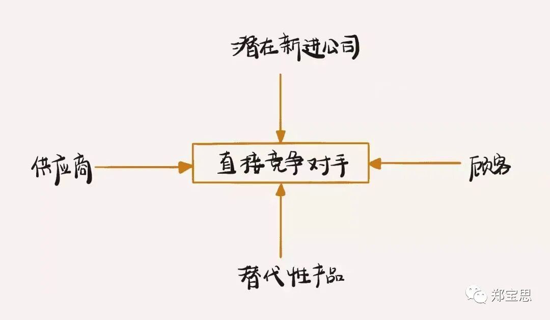 这是迈克尔.波特在1979年提出的,每家企业都受到五个竞争作用力的影响,它们分别是:直接竞争对手、顾客、供应商,潜在新进公司,和替代性产品。假设你在上海定西路开了一家重庆火锅店,谁是你的直接竞争对手?
