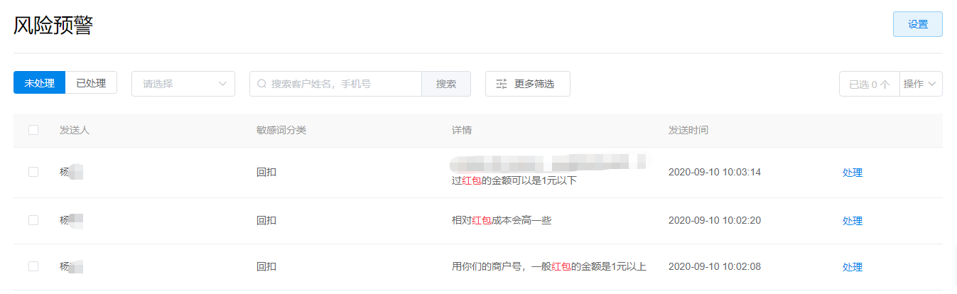为保证服务质量,避免辱骂业主的情况发生。万科物业可将辱骂词设置成敏感词,当管家和业主聊天过程中触发敏感词,企微云【聊天质检】功能会自动推送敏感预警给管理员,管理员可及时反应并处理。当有业主删除管家好友时,系统也会通知提醒,帮助管家及时反应,了解被删除原因,做好业主关系维护。
