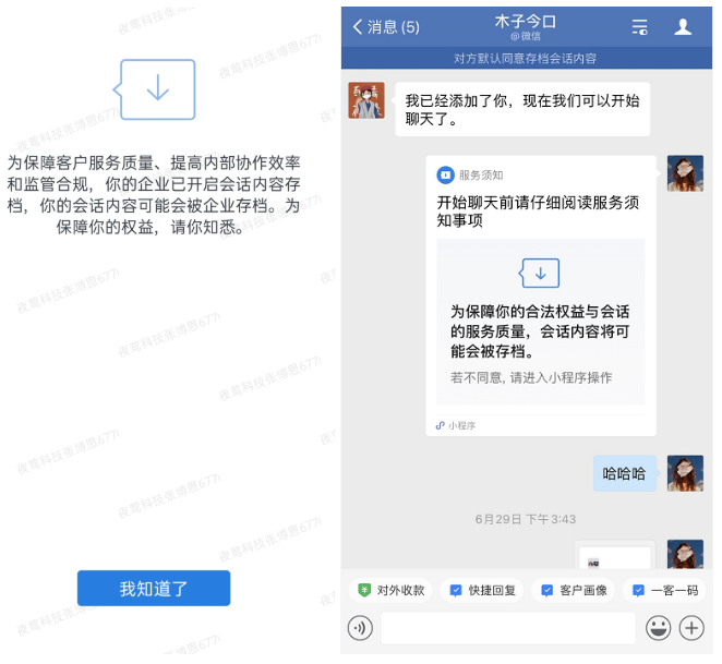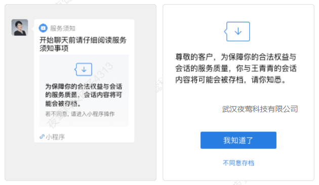 A:员工和外部客户联系时,客户会收到消息存档须知,提醒聊天记录会被保存下来,客户不点击,聊天记录默认保存;客户选择不同意,则单方面保存员工的聊天记录,当然也可以开启客户不同意存档,限制员工继续发送消息提供服务。