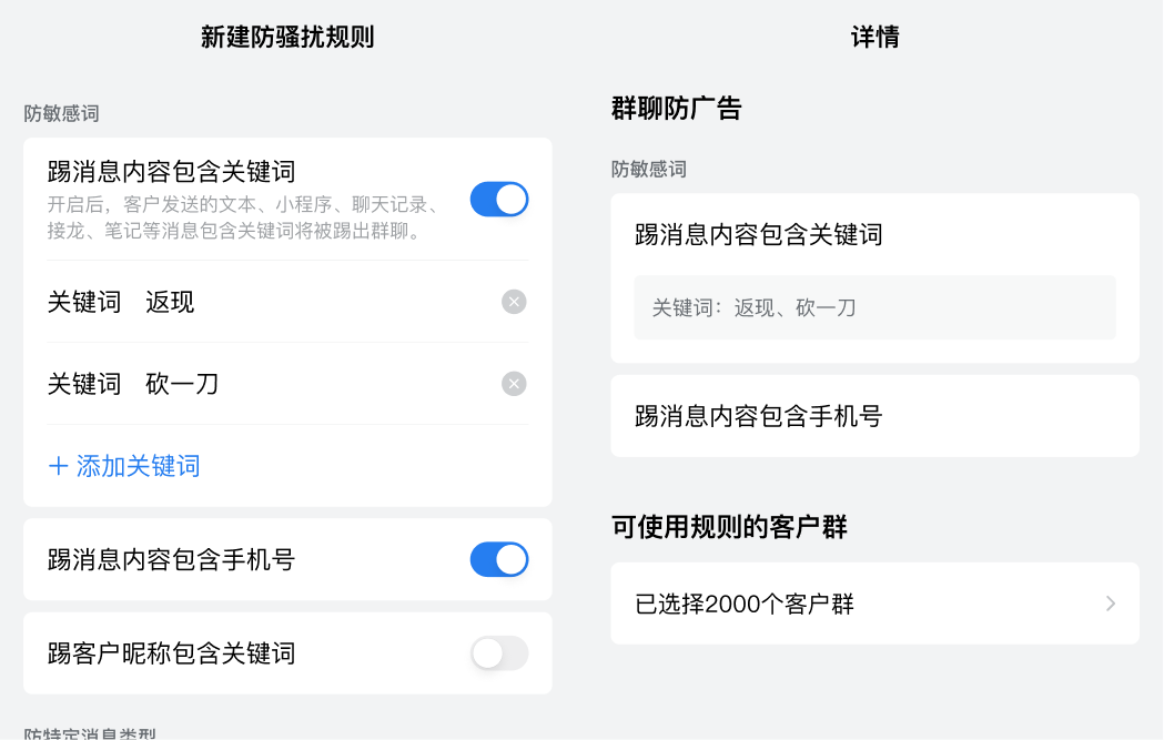 根据企业微信公告,企微于4.1.36新版本中再度升级了防骚扰能力,现在,防骚扰功能不仅可以识别出接龙、聊天记录、笔记等消息中的敏感词,还可以识别手机号。