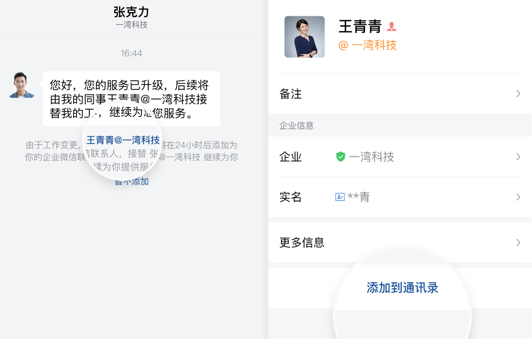 - 离职继承分配后,客户将在24小时后自动继承给新成员,若客户有服务需求,可选择提前添加成员,服务不中断。
