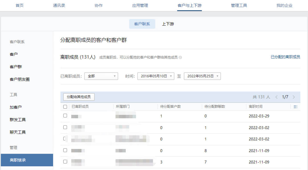 企业微信中客户继承分为两种:一种是离职继承,一种是在职继承。离职继承指的是员工离职后,如果他还有跟进中的客户,可以将客户/客户群分配给其他成员继续跟进。分配后,离职成员的客户将收到通知。如果客户在24小时内不主动点击暂时不添加,新的替代成员将在24小时后自动添加为联系人。更换后,成员还可以查看所有客户的添加情况。在职继承指的是如果员工职能或者客户有变更时,管理员或者负责人可以将需要转接的客户/客户群分配给其他的员工。分配后,客户将在微信上收到转接提醒;默认情况下,客户和替代成员将在24小时后自动成为联系人;如果客户拒绝,替代成员也可以选择主动添加。注:为了防止客户反复受到干扰,如果新成员成功接管客户,原跟进成员将无法继续为客户提供服务;如果新成员未能接管,原成员可以继续为客户提供服务。(1)PC端-------从通讯录将成员删除后,如果他有已添加的客户,可以在管理后台“客户与上下游-客户联系-离职继承”中分配给其他服务人员继续跟进;