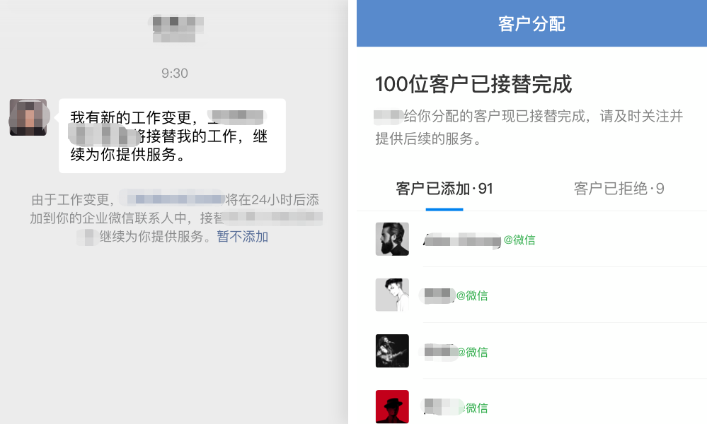 手机端-----“工作台-离职继承”中对离职成员的客户和客户群进行分配。(2)选择已离职成员的客户,可以分配给其他服务人员继续跟进,支持选择部分客户、全部客户和客户群进行分配。分配后,离职成员的客户会收到一条通知,如果客户24小时内不主动点击「暂不添加」,将在24小时后自动添加新接替的成员为联系人。接替完成后,成员也可查看所有客户的添加情况。