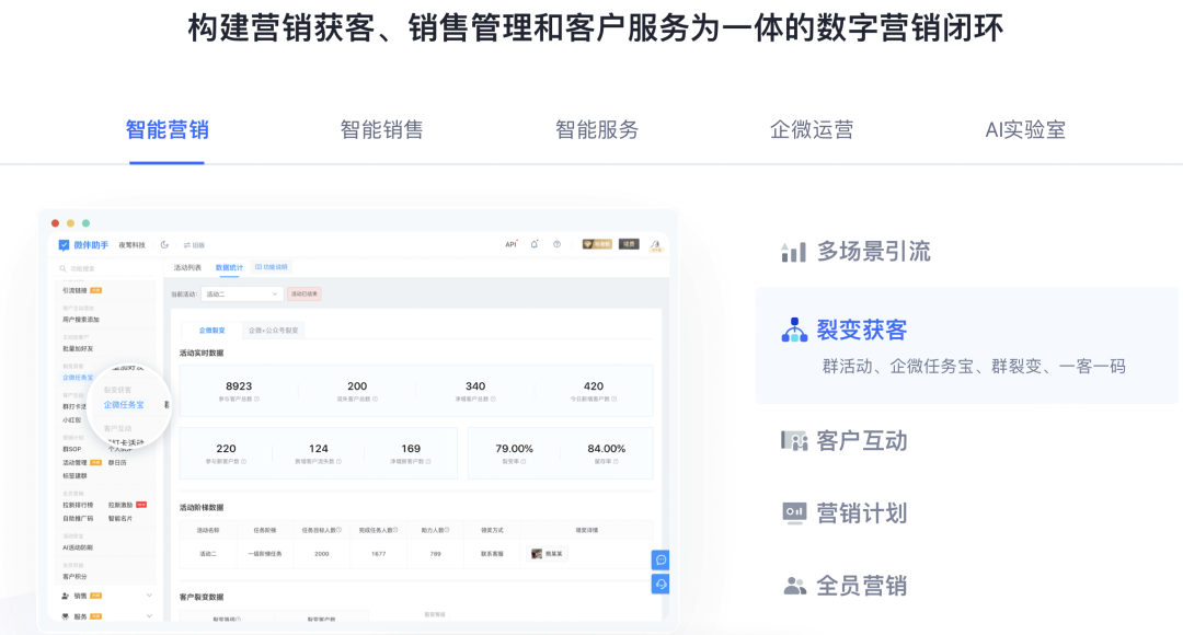 通过启客产品,助力企业营销数智化转型升级,用数据驱动企业决策,以“大数据+AI” 技术赋能企业营销数智化转型升级,实现企业营销降本增效。15 小裂变SCRM