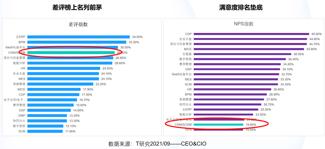 虽然企业对获客、销售管理等的重视度很高,购买过或者自研、定制开发过CRM的企业也不少,但是相比其他的SaaS软件、管理软件,企业对CRM的满意度是比较差的。T研究的一份调研报告也说明了这一点。