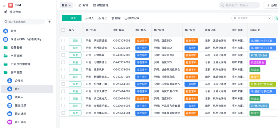 卖给谁?——这是 CRM 客户管理第一个需要回答的问题。回答清楚“卖给谁”,也就回答清楚企业的市场定位。清晰的市场定位有助于企业找到自身的竞争优势,更精准的实施营销策略和销售活动。通常情况下,可以通过详细的客户信息管理与分析(客户画像、RFM等分析),找准目标客户,回答清楚“卖给谁”的问题。简道云 CRM 套件 通过对客户全景信息的统一管理,做到每一位客户的状态、级别、行业、规模等清晰可查: