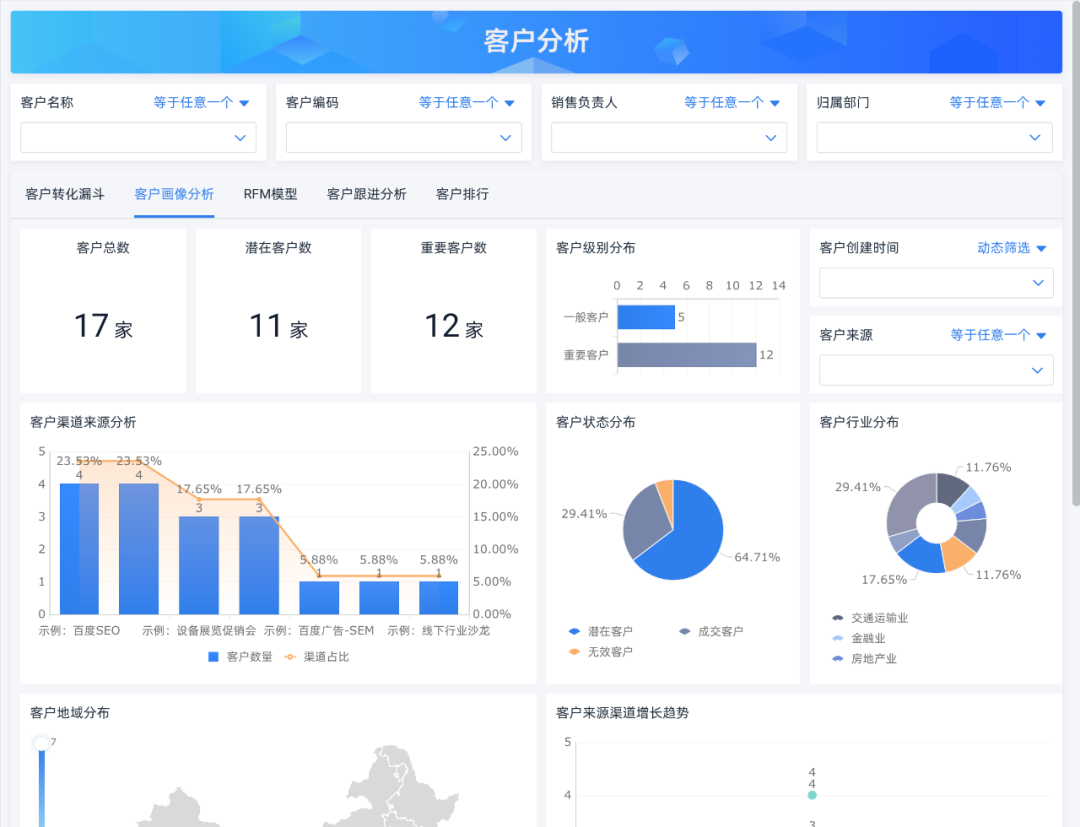 通过详细的信息资料还可以进一步实施客户画像分析,客户来自哪些行业、什么地方、从哪些渠道了解产品,通过客户画像分析精准定位: