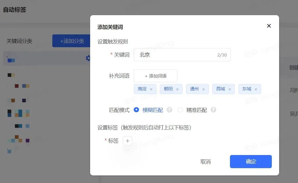 在探马SCRM后台,可以设置聊天关键词。员工在跟客户沟通的过程中,提到了某个关键词,就会触发标签,系统自动给客户打上对应“关键词标签”,并在企业微信聊天界面的侧边栏“客户详情”中显示。