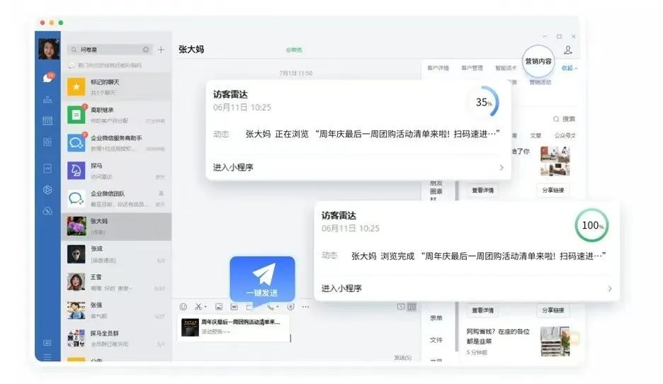 现在是个内容营销的时代,我们在跟客户沟通的过程中,经常需要发送各种各样的内容素材,来提升信任度,帮助做转化,比如客户案例、使用指南、产品效果等等。在探马SCRM后台,创建营销内容,当客户浏览的时候,系统能够立即记录。“访客雷达”会提醒你,客户读了那些内容、读了多少,帮你了解客户的浏览情况,识别客户意向。