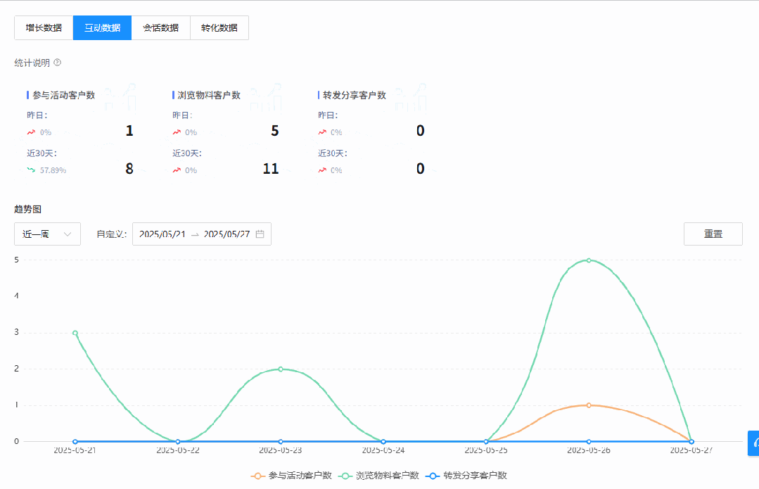 无论是客户分析还是客户群分析,「运营数据洞察」都提供了全面的互动数据监测,包括参与活动客户数、浏览物料客户数、转发分享客户数等关键指标。更为贴心的是,系统还支持按今日、近一周、近一个月以及自定义时间段进行灵活筛选,让数据查看更加便捷高效。