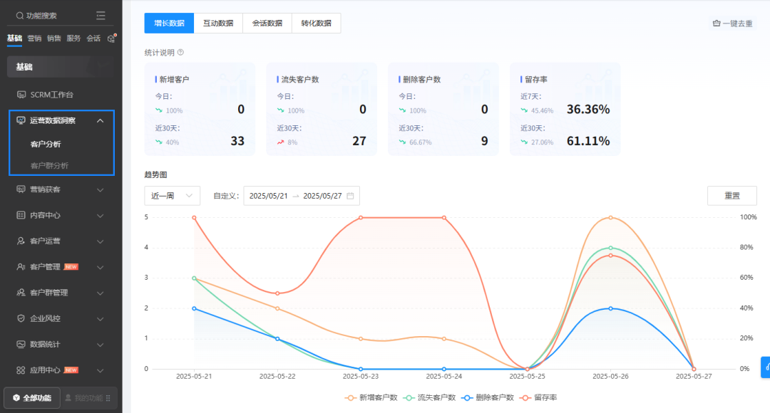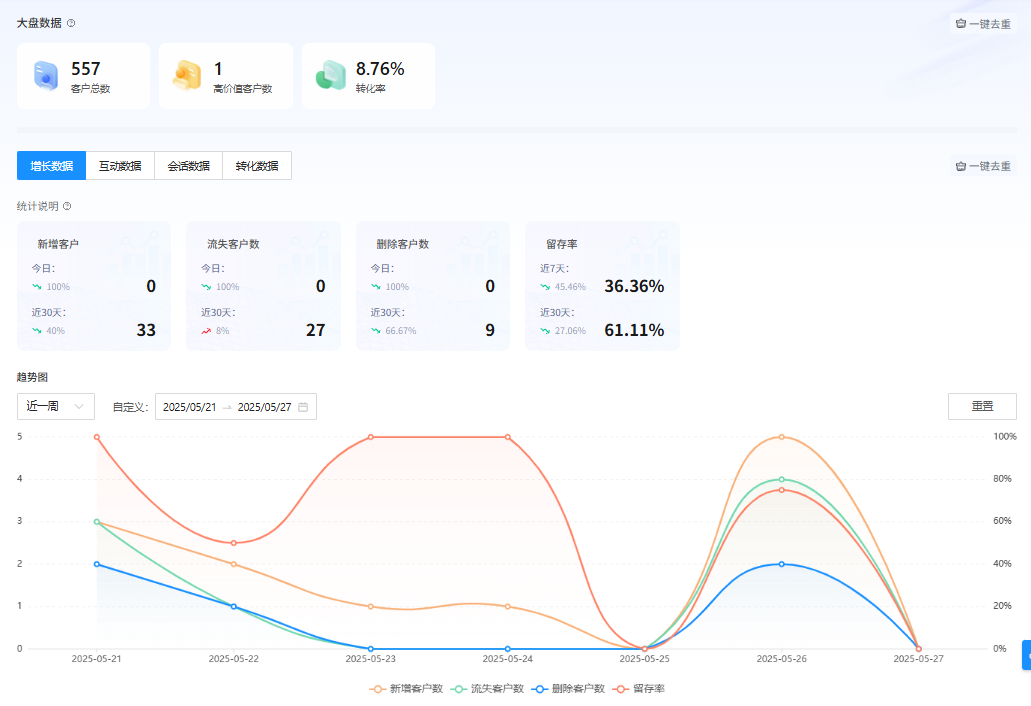 举个例子,当发现某天新增客户数激增但留存率下降时,可以立即排查当天的欢迎语设置或引流渠道质量,及时优化策略。